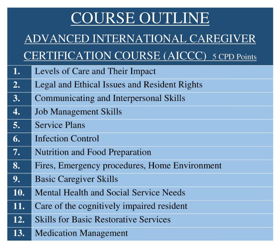 The Oxbridge Institute of Professional Development-UK (OIPD) and Cambridge Global of Learning- UK (CGL). We are accredited courses Internationally and we are offering you a convenient and simple way to become a certified caregiver by taking our International Caregiver Certification Courses (ICCC, AICCC, IALMCC, MWCC and CPR(AED).